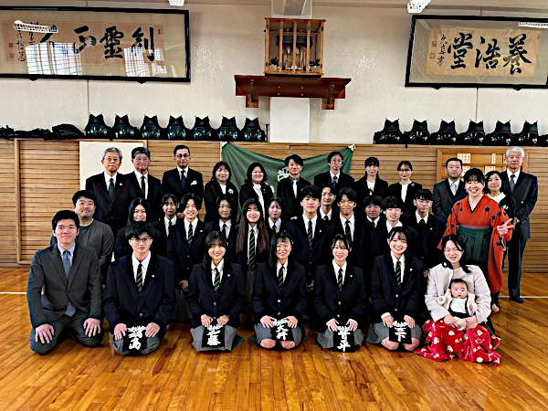 剣道部OB・一泉剣友会の本保義浩会長(泉丘30期)、中島俊明(同26期)、小林真(同27期)、俵広樹(同57期)、徳田夏葵(同58期)、吉田宏康(同60期)、瀧川智之(同62期)の計7人が、卒業式が行われた3月2日午後、母校道場を訪れ、晴れてOB会員となった男子1人、女子4人に剣友会の名札を贈り、卒業を祝った=写真=。
